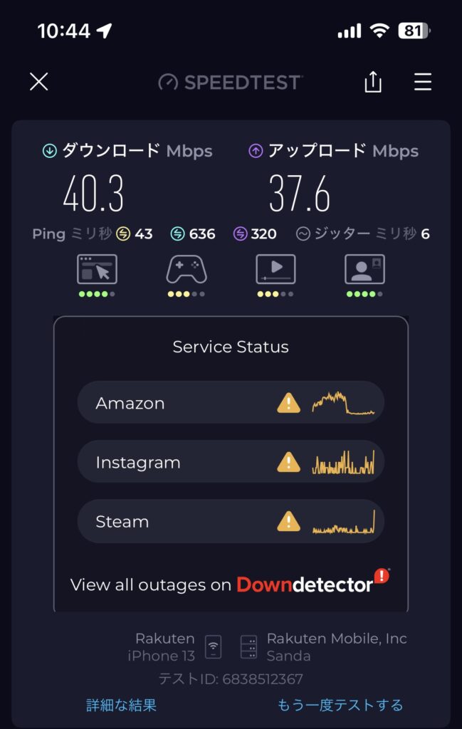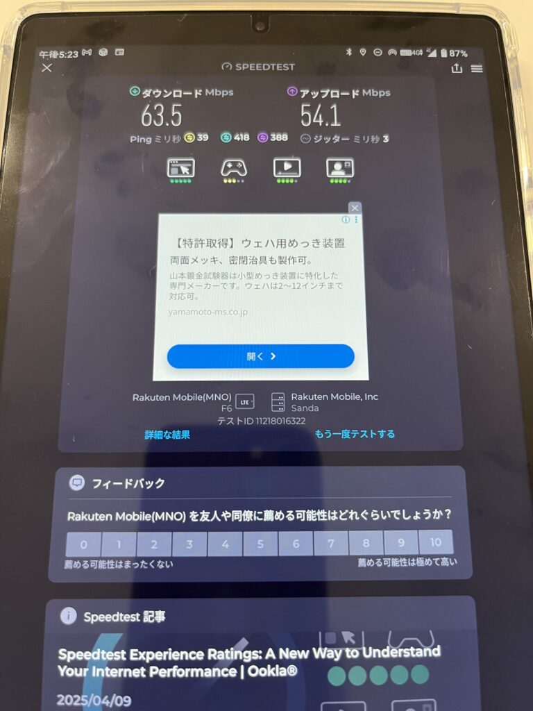 「HEADWolf Fpad6」に楽天モバイルのSIMでの通信速度。